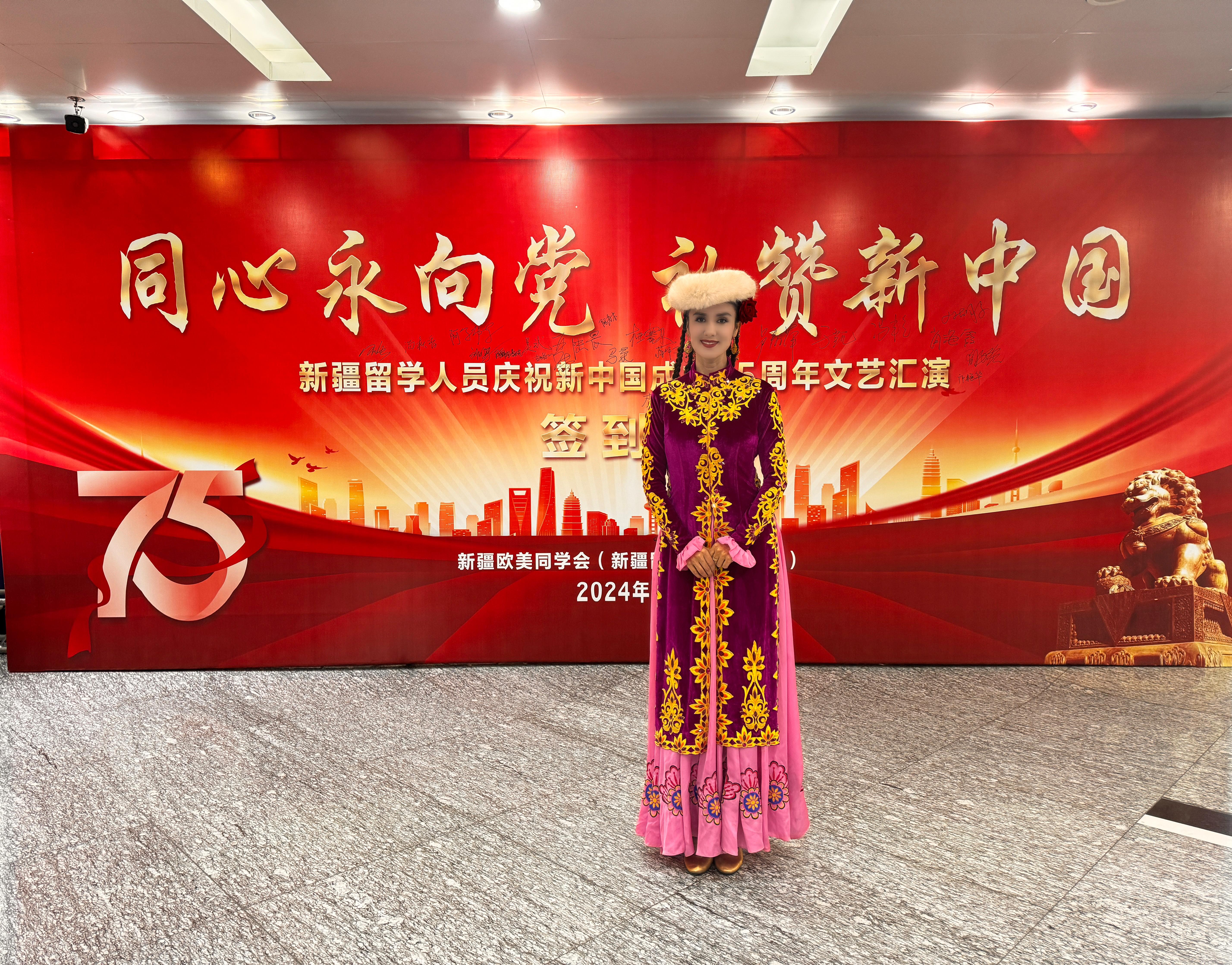 2024年9月27日,由新疆欧美同学会(新疆留学人员联谊)主办的“同心永向党 礼赞新中国”新疆留学人员庆祝新中国成立75周年文艺汇演在新疆医科大学举办,舞蹈学院教师热娜古丽·阿不力皮孜参加本次文艺汇演。