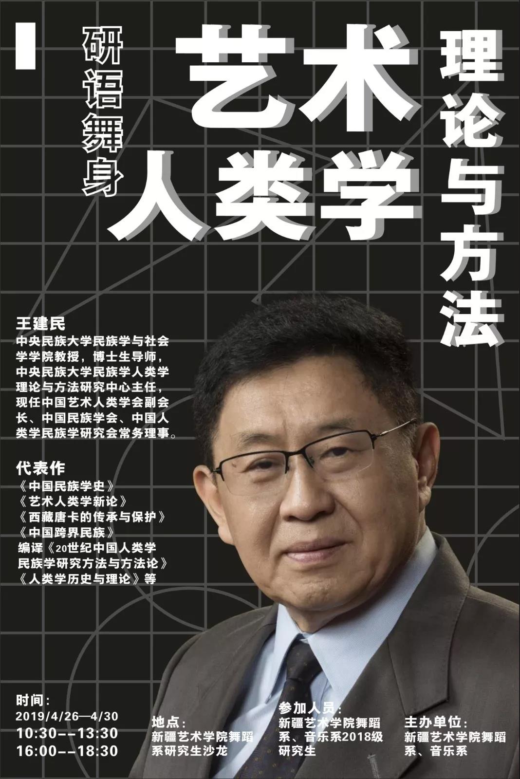 2019年4月26日到4月30日,王建民教授于新疆艺术学院研究生沙龙进行授课,并从艺术与艺术人类学、艺术人类学理论范式的转换、艺术人类学理论研究的几个问题、田野民族志与艺术研究、艺术民族志访谈法的运用等专题入手,运用艺术人类学的理论与方法,为民族民间艺术及专业化艺术实践提供可靠的指导,深入探讨艺术实践者的艺术行为背后的逻辑观念和文化动因。